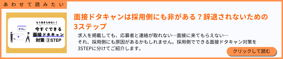 「面接に来ない」問題が発生しやすいのがここです。連絡の遅さ、日程調整のしづらさ、案内の不備が積み重なると、候補者は静かに離脱します。ツール等を活用し、スムーズな案内と日程変更等のハードルを下げる仕組みづくりが重要です。