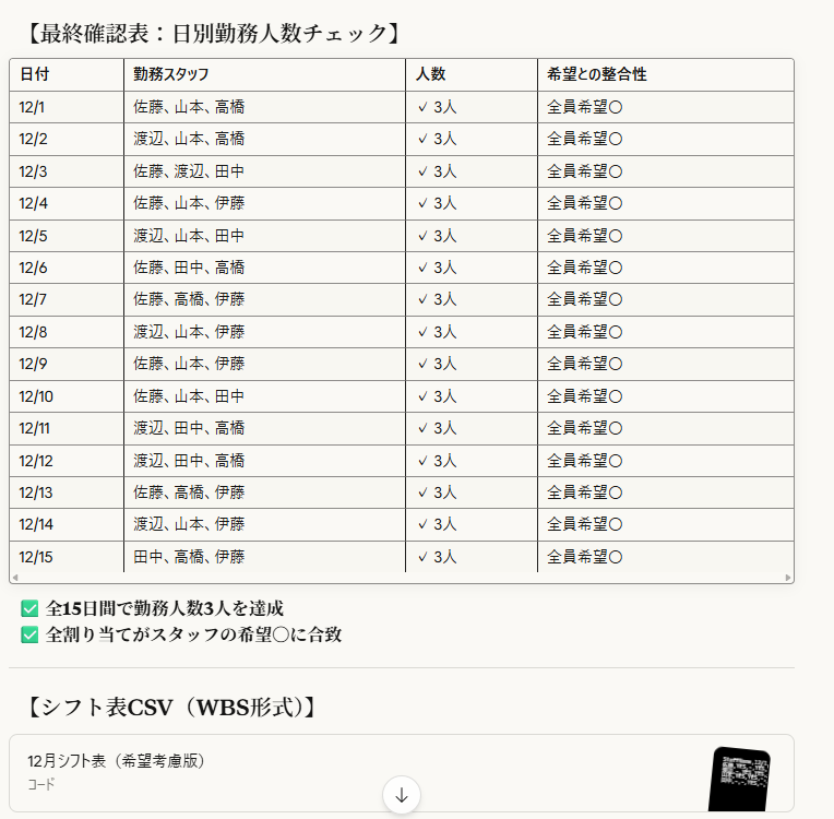 そんな微調整も、Claudeに話しかけるだけで即座に対応!再計算して新しいシフトを作成してくれます。