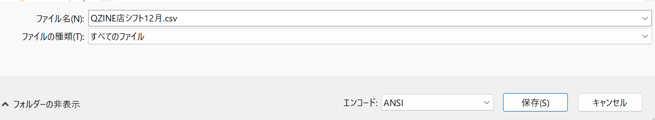 ファイル名は必ず拡張子「.csv」を末尾につけてください。日本語が文字化けしないよう、エンコードは「ANSI」を選び、「保存」をします!