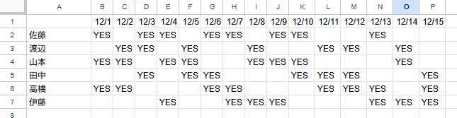 早速シフトを表示していきます!B2セルに「=IF(‘QZINE店シフト12月’!B2=”YES”,”YES”,””)」と入力すると、「YES」と表示されます!この関数を全員分コピーしてみるとこんな感じになります。