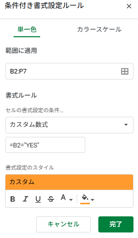 画像の通り、セルの書式設定の条件を「カスタム数式」にし、下に「=B2=”YES”」を入力。書式設定のスタイルで、先ほど変えた文字の色と同じ色を選び、「完了」を押すと…